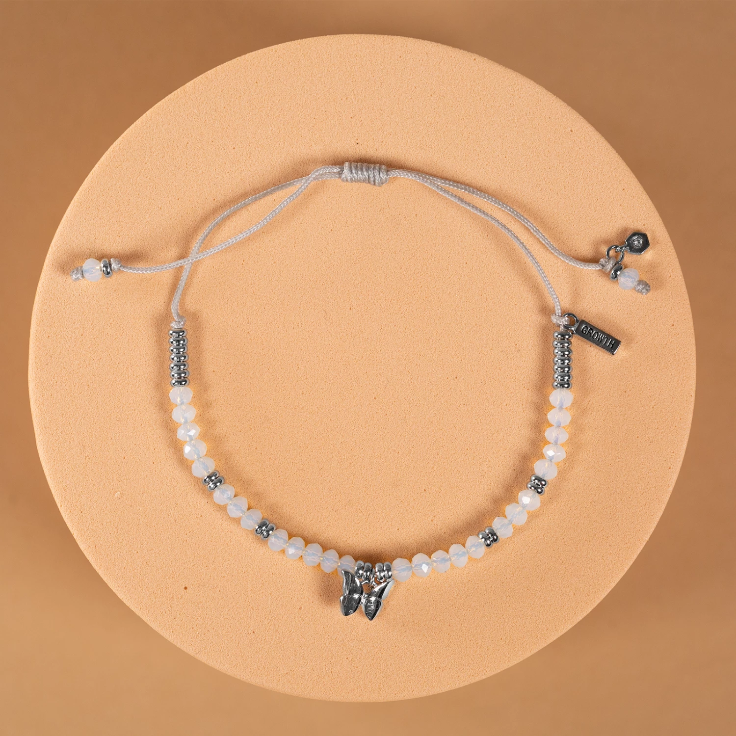 Butterflies symbolize transformation, so we’ve inscribed “Growth” on the small silver tag as a reminder of the simple beauty of change and renewal.