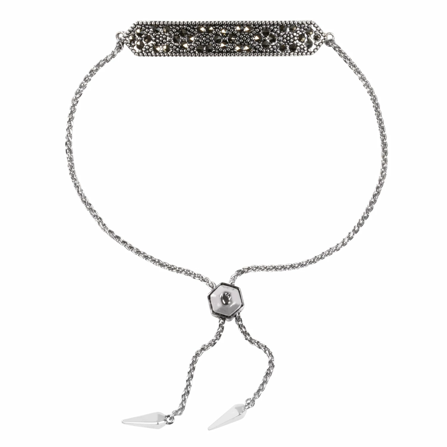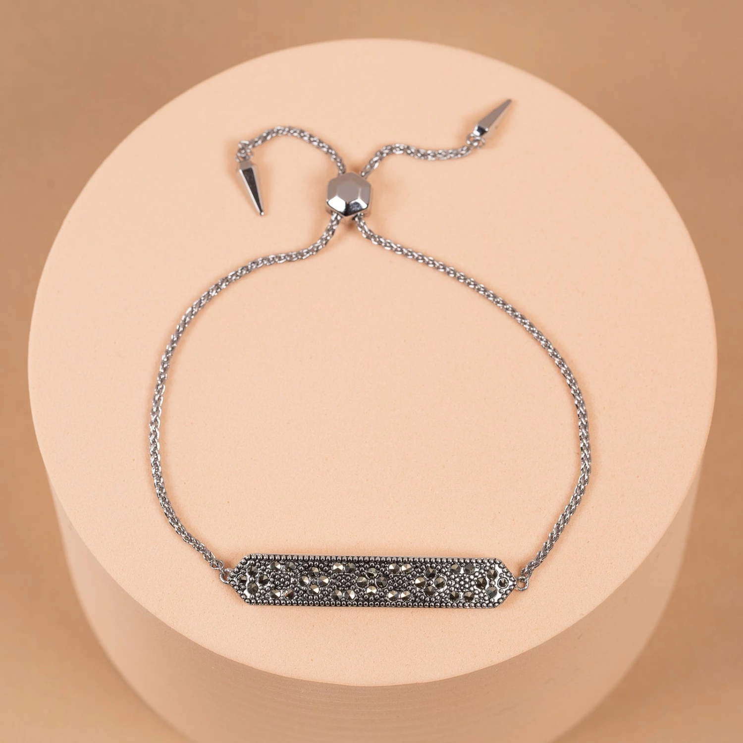 Hey there, fashionista! This Silver Deco Marcasite Bolo Bracelet is on-trend and ready for its debut. Featuring 36 marcasite crystals and an adjustable motif bolo, this bracelet makes a beautiful gift for a loved one or yourself!