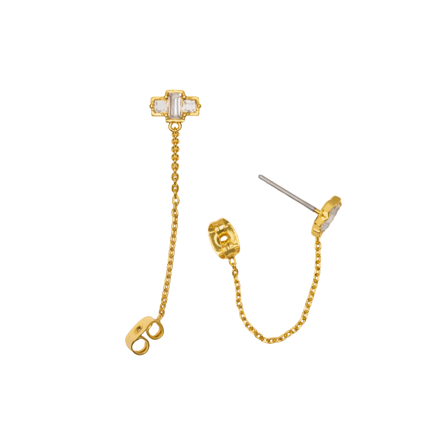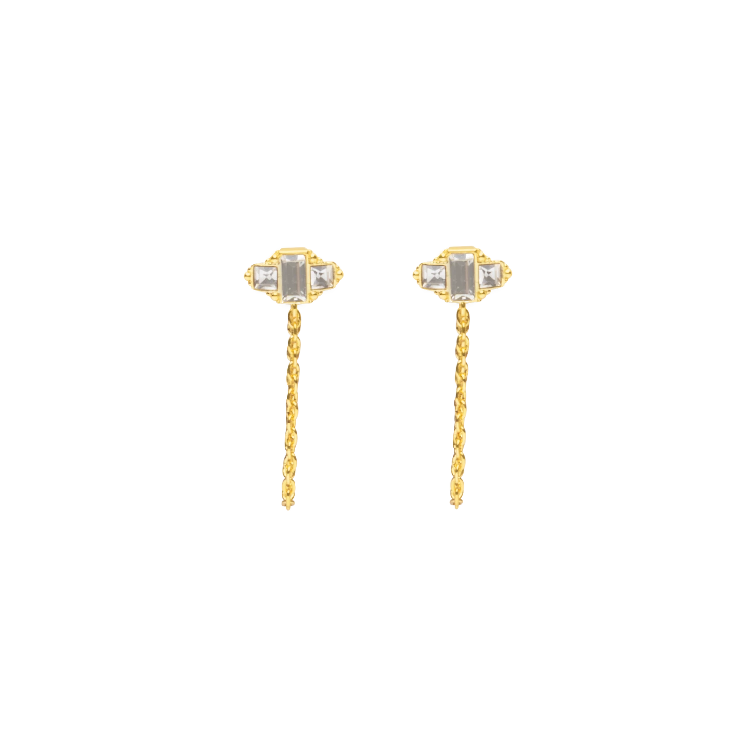 These Gold Baguette Stud and Chain Earrings will be the hit of those special occasions or for daily wear! These dainty, art deco-inspired stud earrings feature three vertical baguettes on the studs and a dainty chain (chain drop is 18 mm) connected to the back stopper.