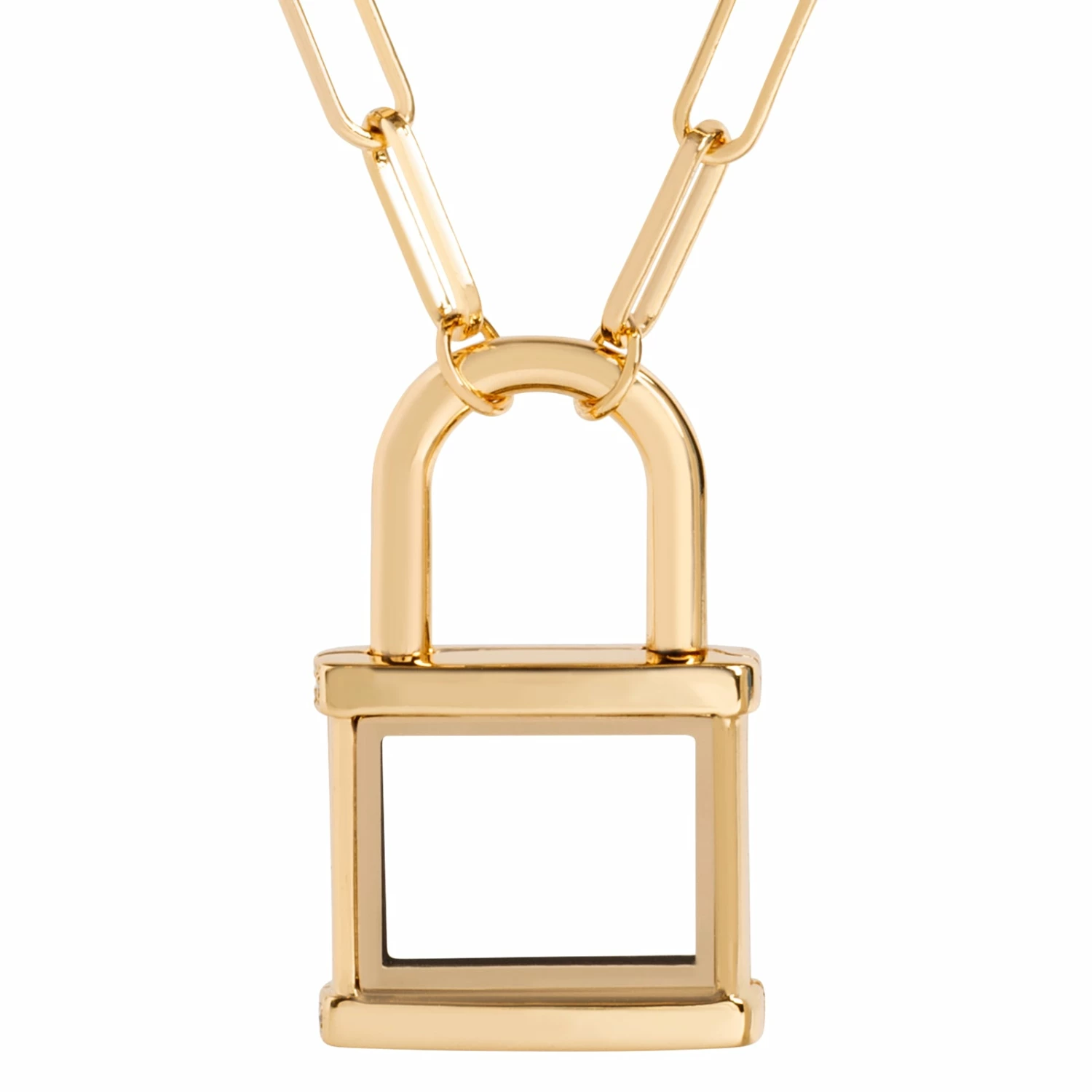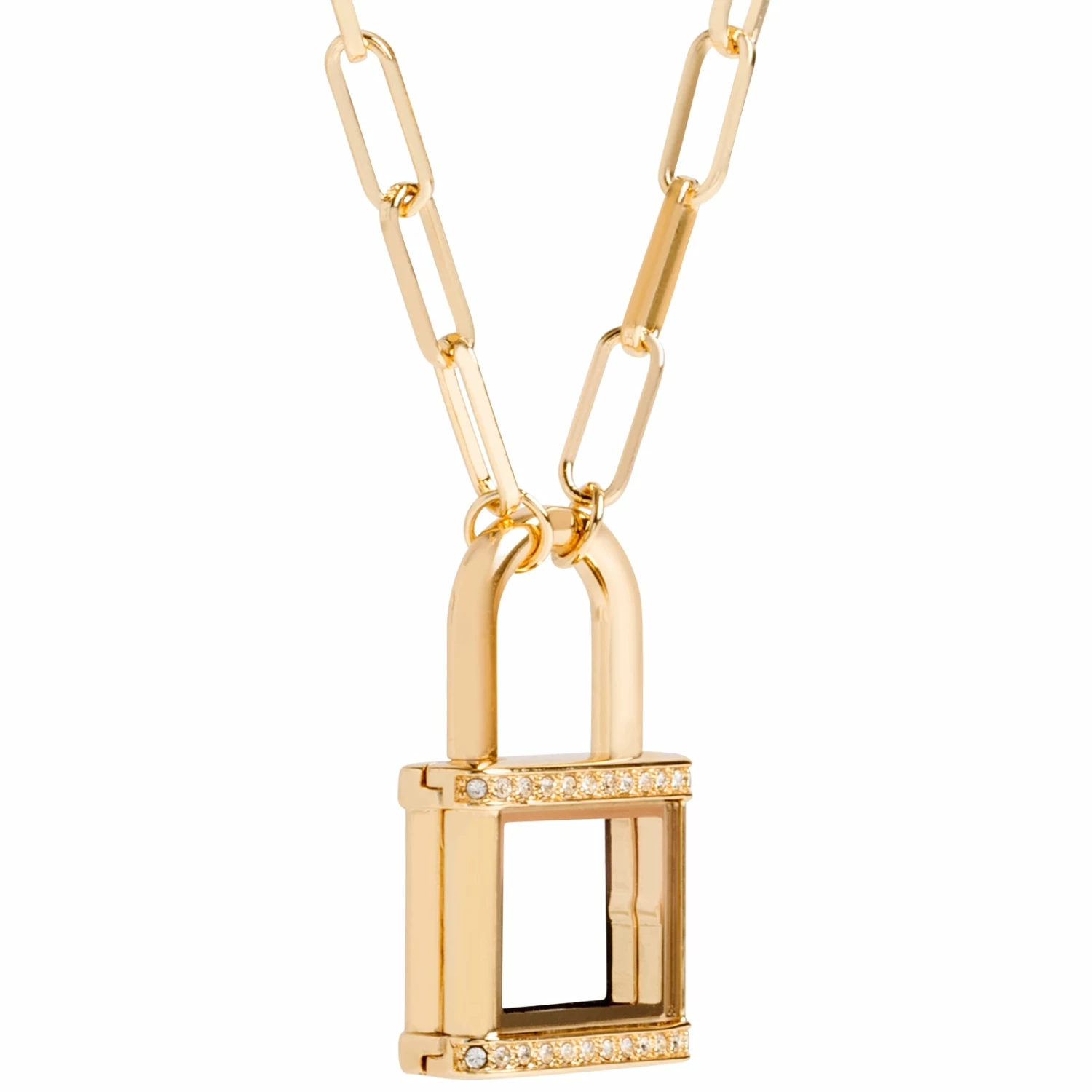 Add your story with meaningful Charms and lock it up so it stays safe! Our new Gold Padlock Living Locketยฎ holds 3-5 of your favorite Charms and comes with this trendy large link Chain Necklace. This piece is versatile and chic! Wear it with the shimmering Crystals sparkling out for all to see or turn it around for a more subtle look. This gorgeous style is the perfect gift for anyone you deem special.