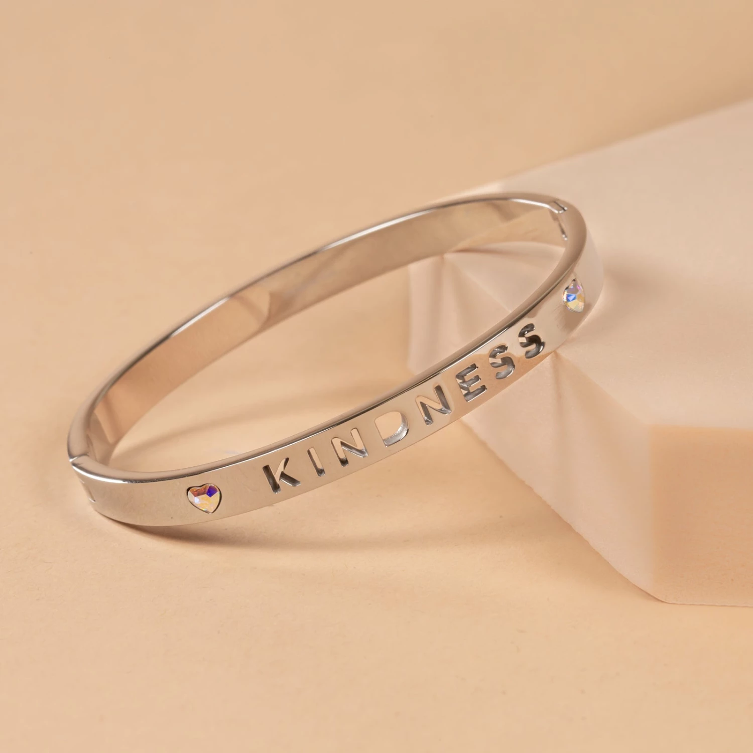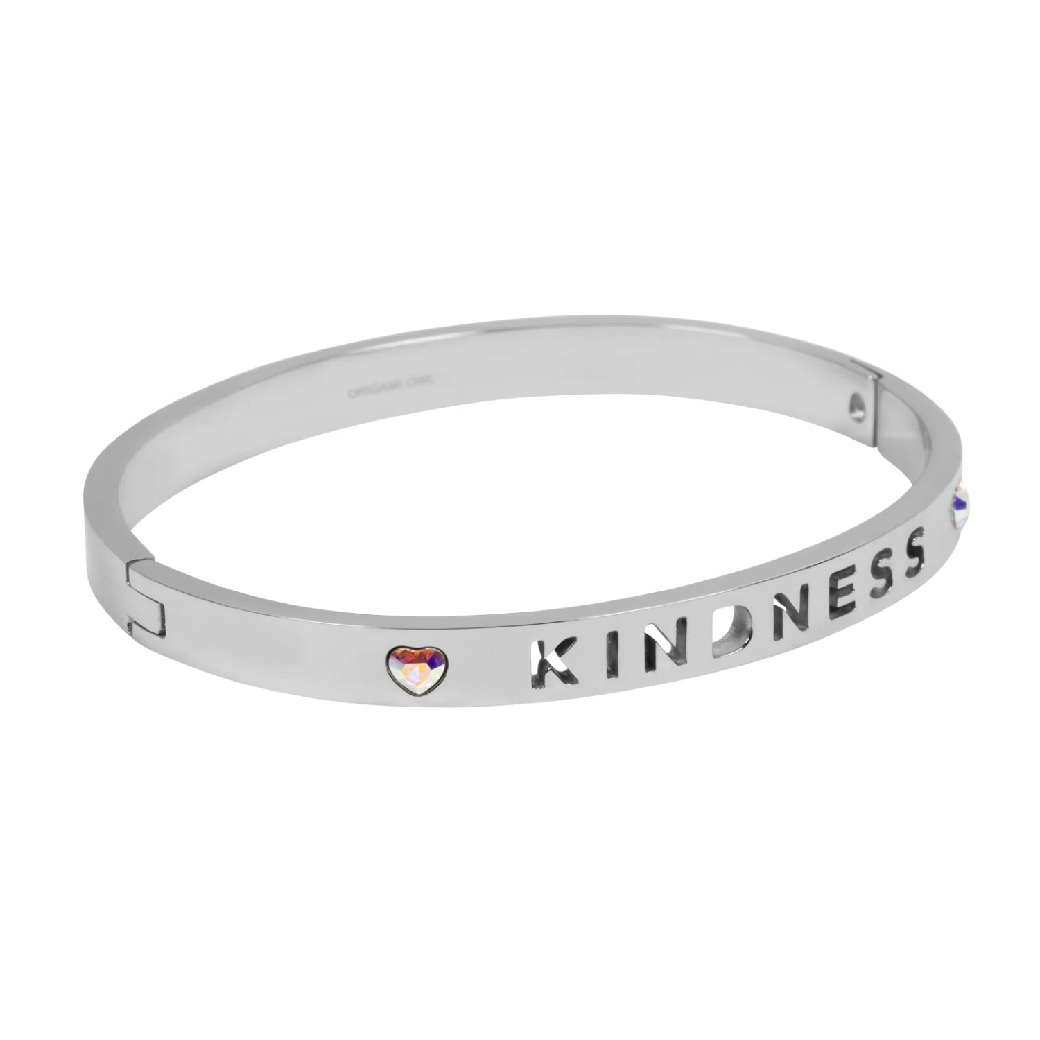 Kindness is contagious β pass it on! This Silver βKindnessβ Hinge Bangle Bracelet features two crystal hearts and is a perfect addition to your bracelet collection.