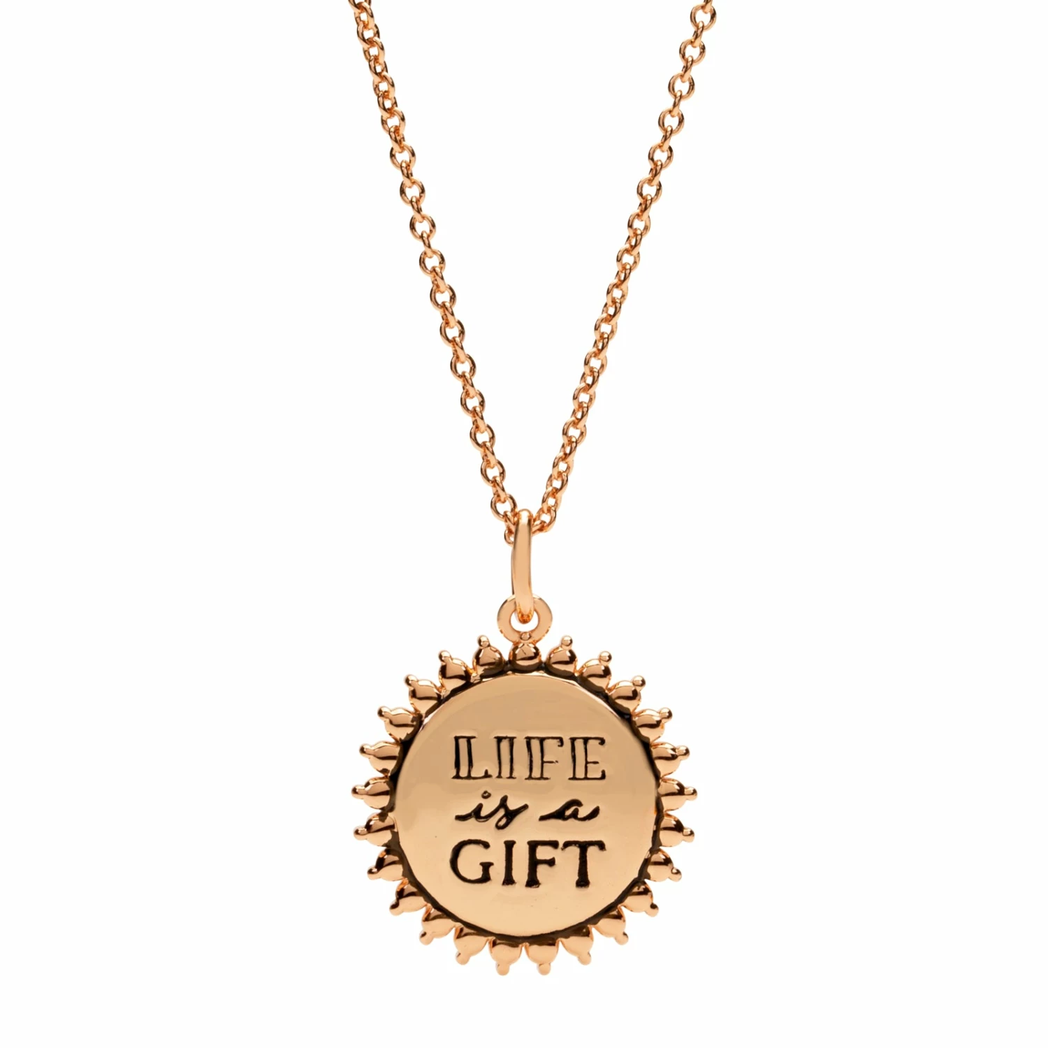 Don’t ever forget that life is a gift. That is why they call it the “present.” The north star on the front of this special Rose Gold Pendant Necklace reminds us (and guides us) to cherish every moment. Attached to an 18-20″ chain, “Life is a Gift” is delicately inscribed on the back on the pendant, which keeps the message close to the heart.