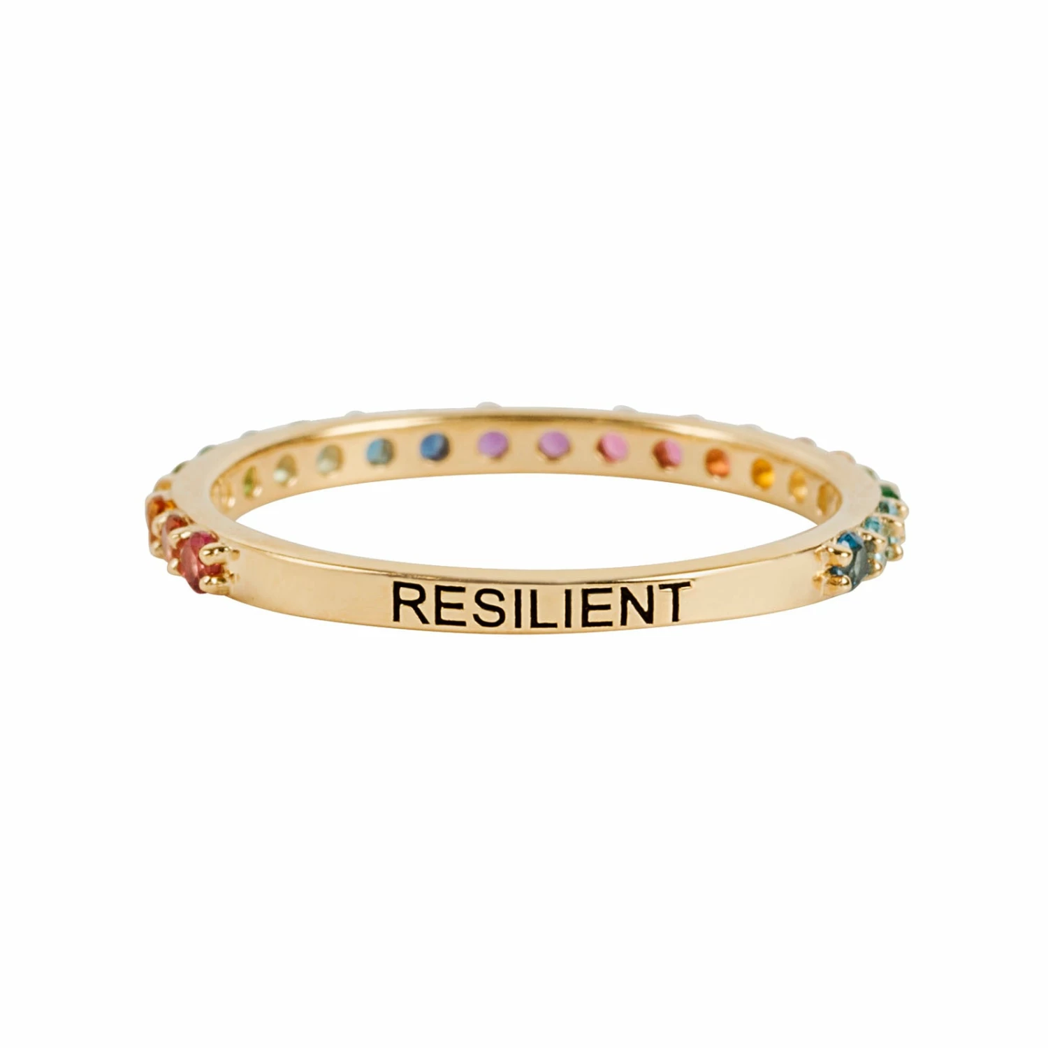 A gentle reminder that with no rain, there is no rainbow, so we must stay “Resilient”. This Gold Stacking Ring looks amazing on its own with its shimmering Rainbow Pave Crystals, or stacked with our other Dainty Rings!