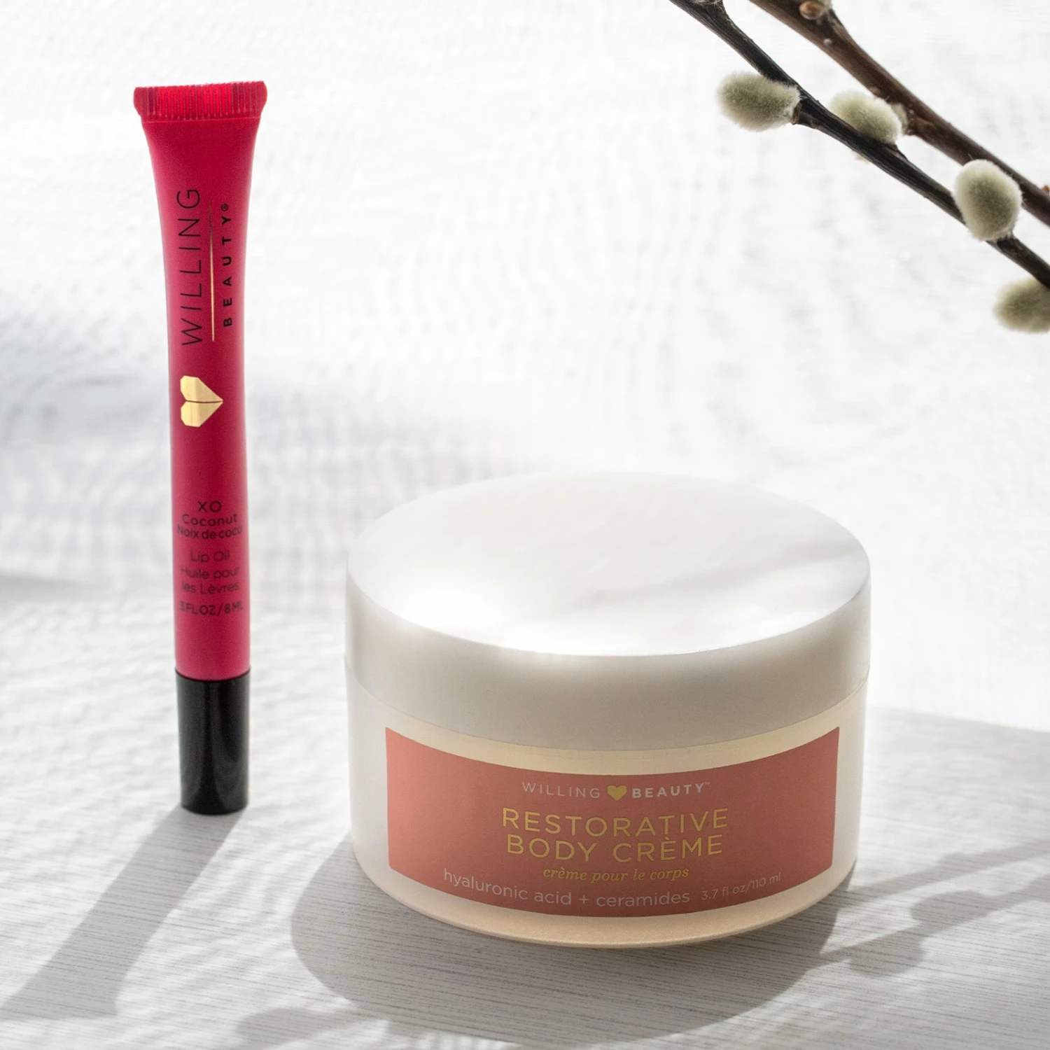 Hey there, mama: we see you and know youโre working hard. Let us do some of that work for you with this Soften & Restore Gift Set. This gift set includes Willing Beautyยฎ Restorative Body Crรจme (luxurious, subtly-scented, Bergamot Citrus crรจme will quickly become your go-to body moisturizer) and Limited Edition XO Coconut Lip Oil (transparent gel-oil hybrid โ infused with a rich mix of argan, marula and avocado oils โ leaves lips balmy-soft and subtly luminous). This gift set will leave your skin and lips moisturized so youโre ready to take on the day!